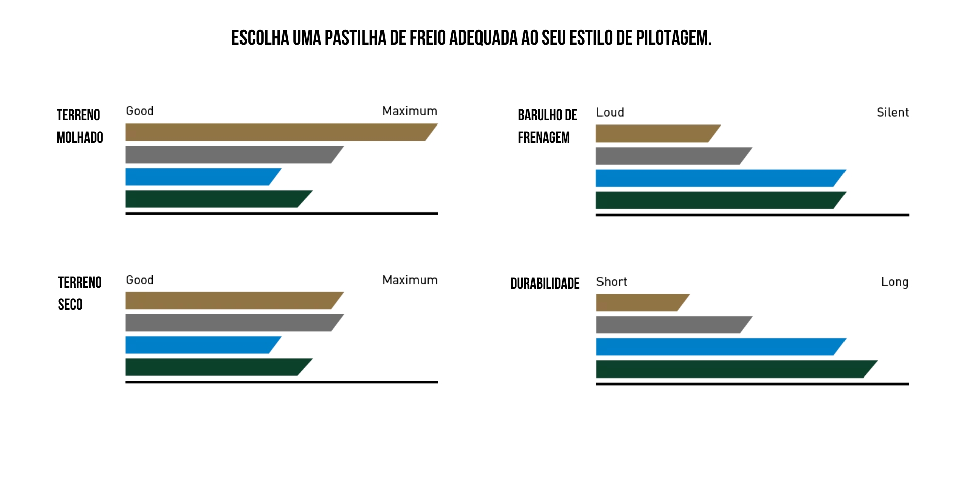 Conforto (azul): Alta durabilidade e modulação precisa. Esta pastilha de freio é ideal para iniciantes e pilotos que preferem modulação precisa e durabilidade em vez de mordida.